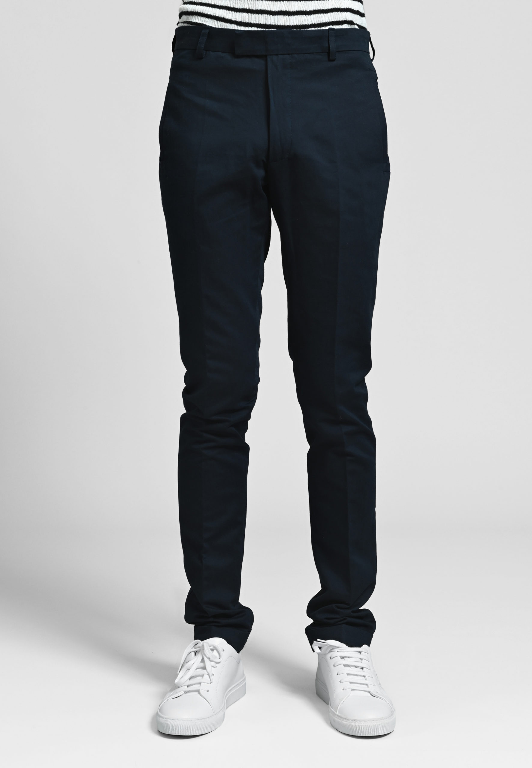 Pantalon bleu marine, slim fit, poches à découpe rectangulaire, une poche dos, ourlet revers. 70% coton 30% lin. Lavage machine 30°. Total Look: VESTE SIA NAVY