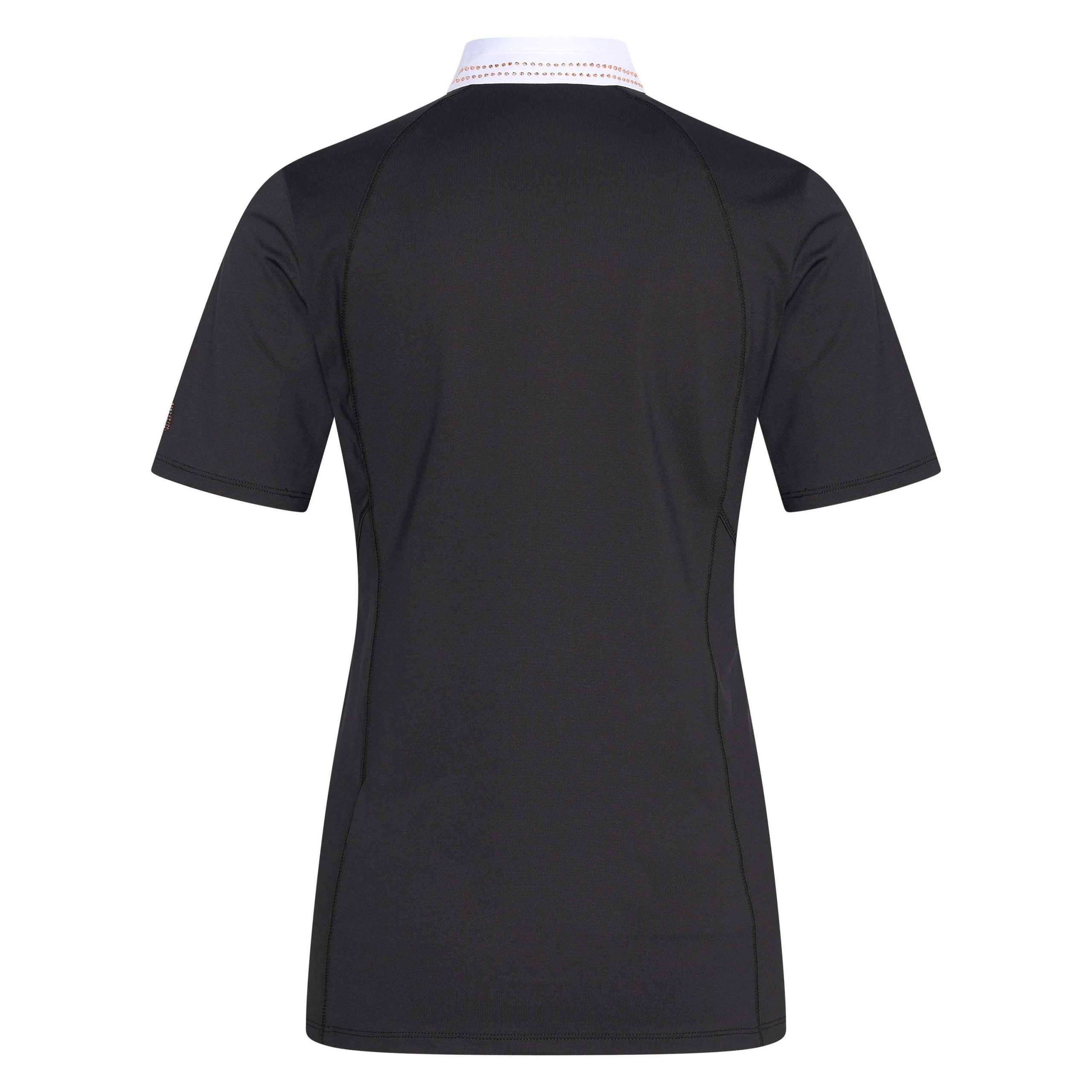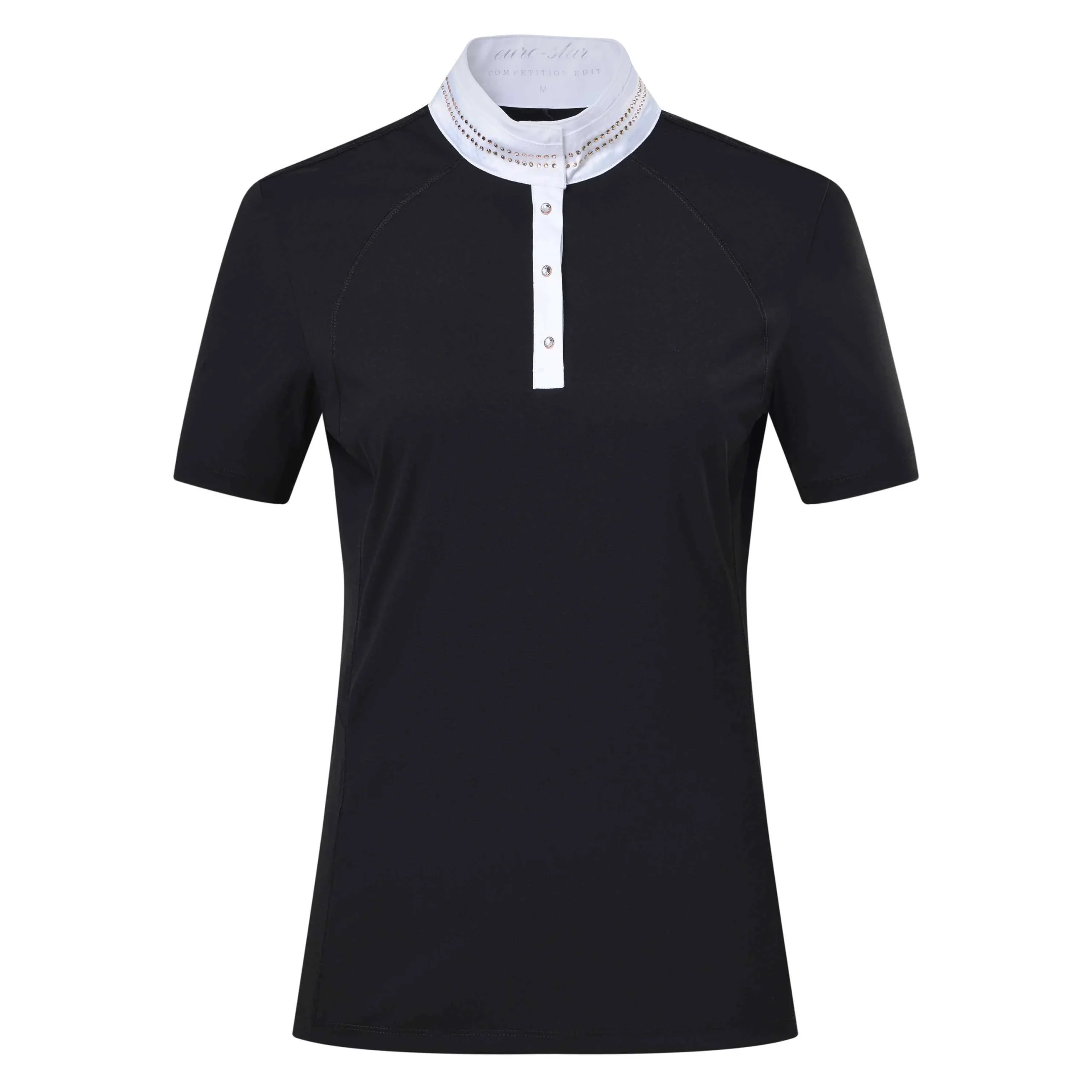 Top de concours manches courtes avec des détails et lignes raffinées* Plastron en satin plissé fixé au col * Boucle pour veiller à ce que le plastron reste en place, couvert de strass * Boutons à pressions sur le col * Logo à strass sur le bras gauche * Zip caché à l’arrière du col