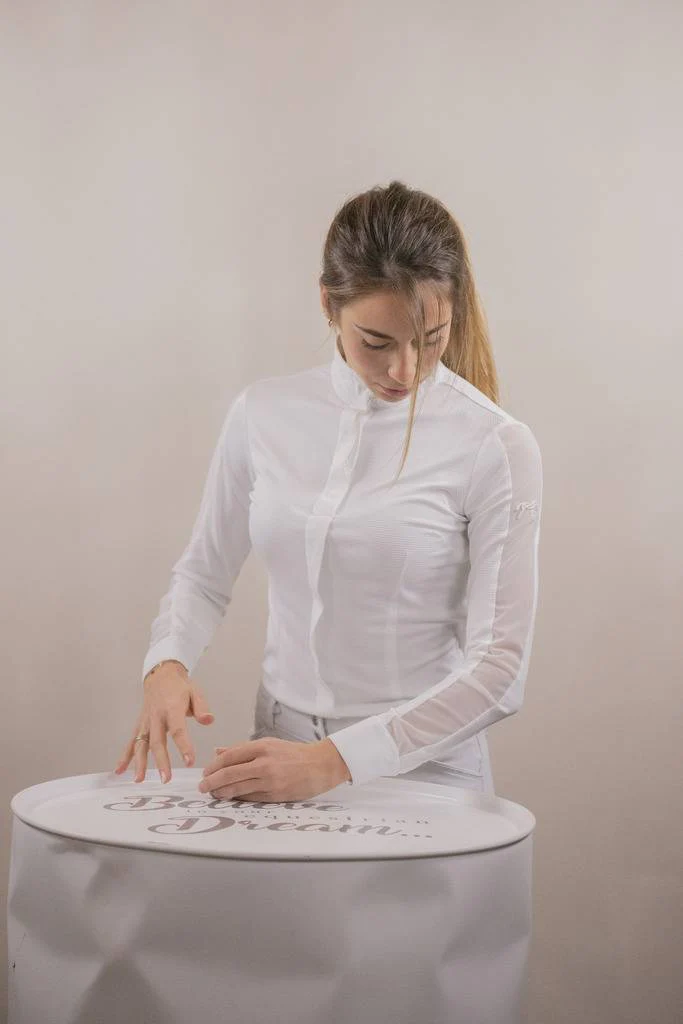 Polo de concours Las Honey confectionné dans un tissu blanc alvéolé léger, respirant . Il est composé d’un col officier rehaussé de délicates surpiqûres ton sur ton et d’un plastron ton sur ton qui se ferme par un rang de bouton cachés par une patte. Sur la manche longue gauche le logo Pénélope apparait dans une matière type gomme. Chic et technique, il se porte facilement en concours hippiques pour un look sobre et efficace.