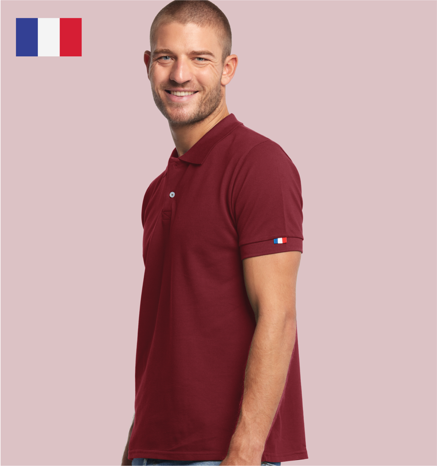 Polo homme Made in France coton bio personnalisable certifié OCS et OEKO-TEX 100. Maille piquée 220 g/m² coupe légèrement cintrée, col et manches bord-côte, patte de col 2 boutons. Étiquette tricolore sur la manche. Personnalisable, du XS au 6XL, plusieurs coloris. Réf : 190A00156