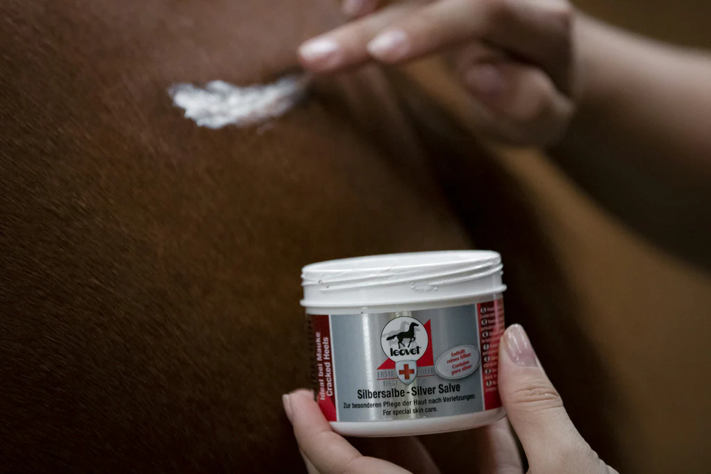 Contient de l’argent pur, qui en raison de sa surface fortement agrandie est en mesure de dégager constamment des ions d’argent. Ceux-ci développent ainsi leur effet antiseptique et peuvent repousser les bactéries. Les inflammations faiblissent, la peau se régénère et s’apaise. Des huiles végétales de qualité supérieure rendent l’humidité à la peau gercée et assouplissent. Peut également être utilisé comme prévention et protection des paturons contre l’humidité et les bactéries.