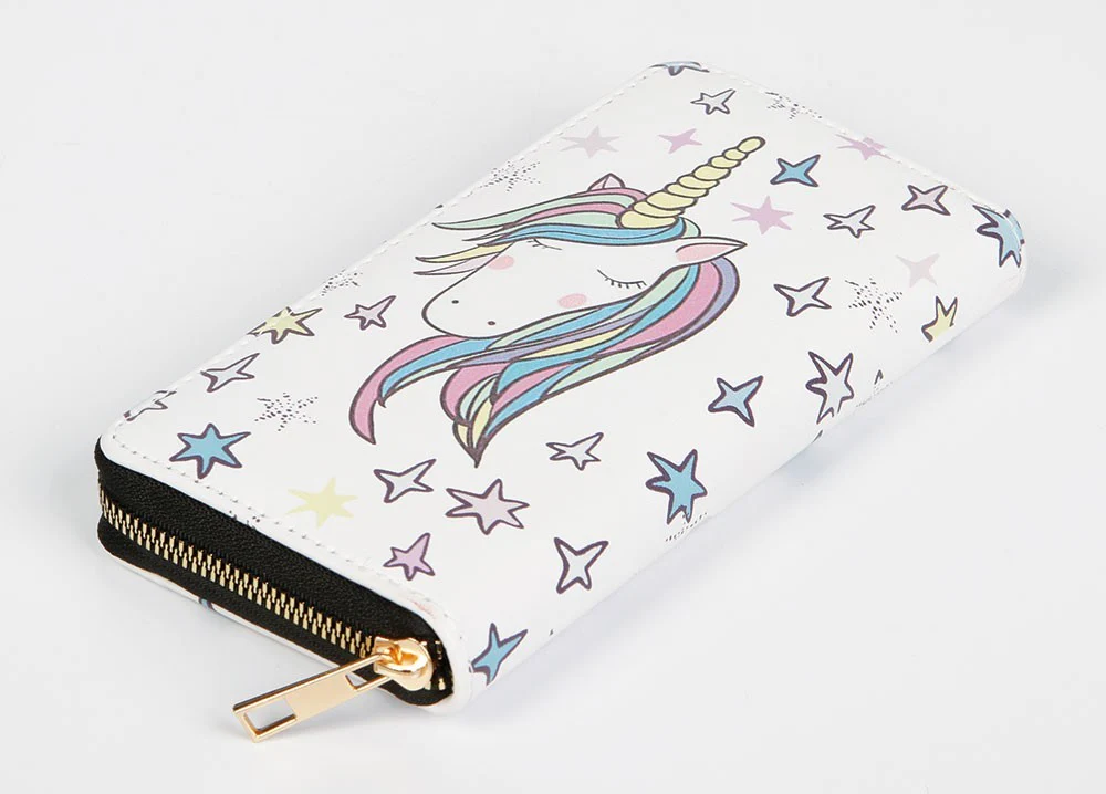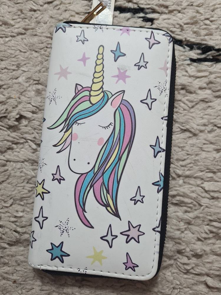 RAYURES ET TRACES SUR LE CUIR Porte-monnaie avec fermeture à glissière et diverses pochettes pour les monnaies et les billets.Motif LicorneDimensions : 9,5 x 19 cm Matière : PU