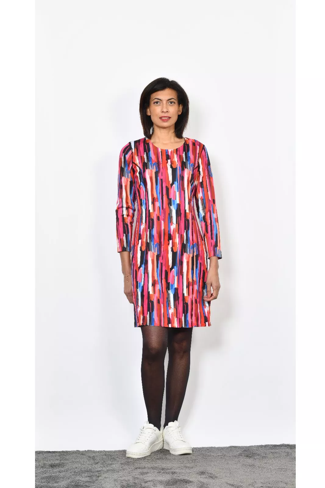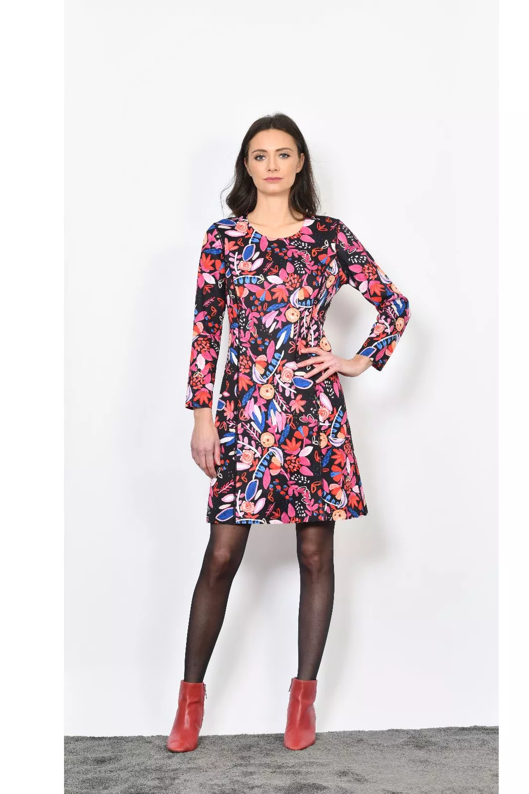 Robe longueur genoux col rond manches longues imprimée réversible