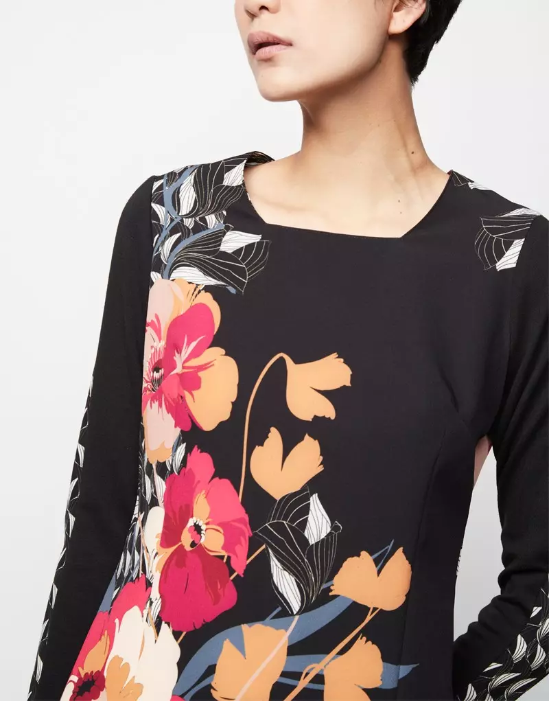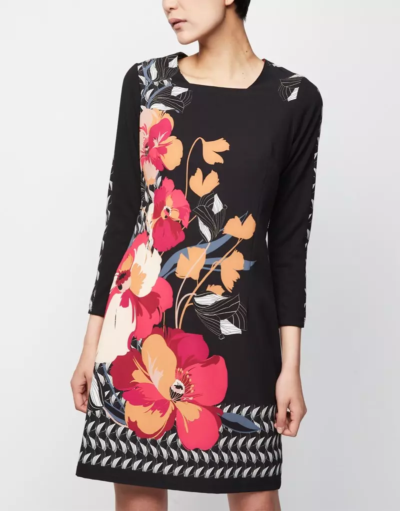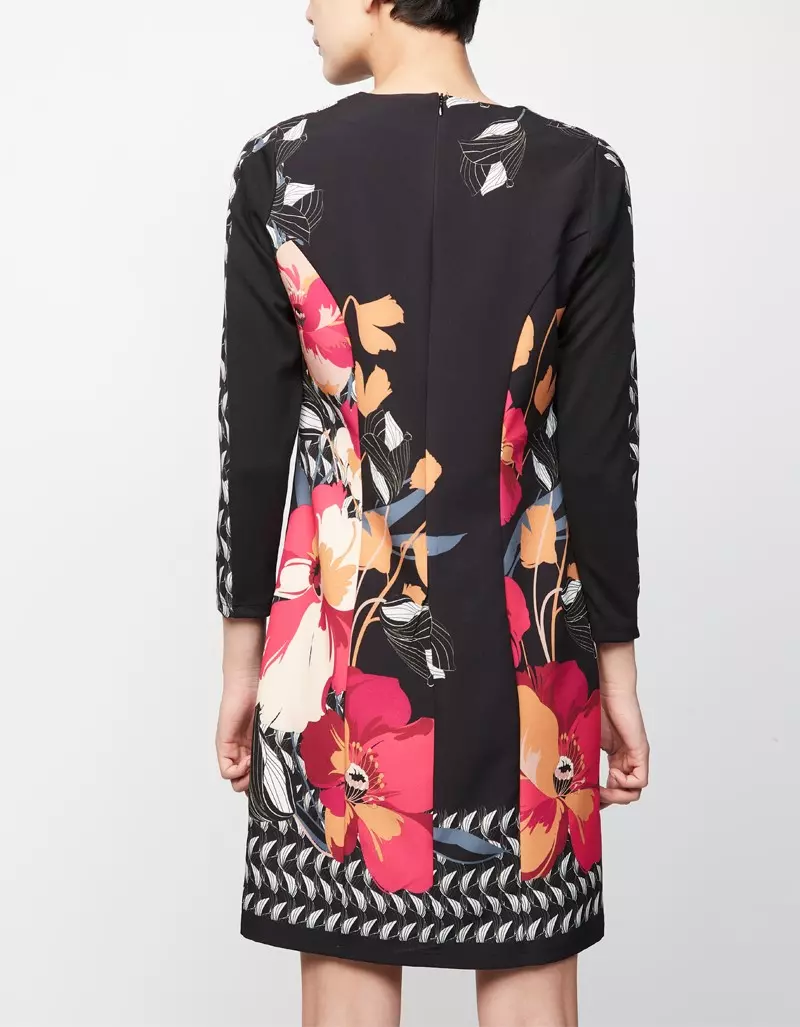 Robe longueur genoux col rond manches trois-quarts motifs placés
