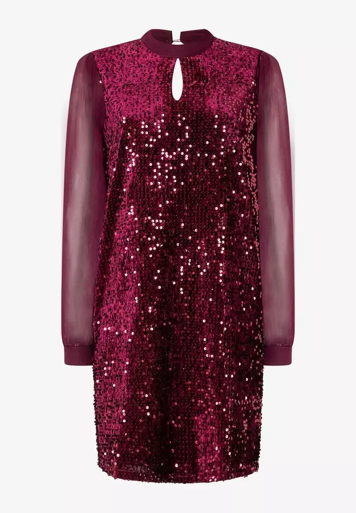 Robe Longueur Genoux Col Rond Montant Goutte Manches Longues Voiel Transparent Et Sequins