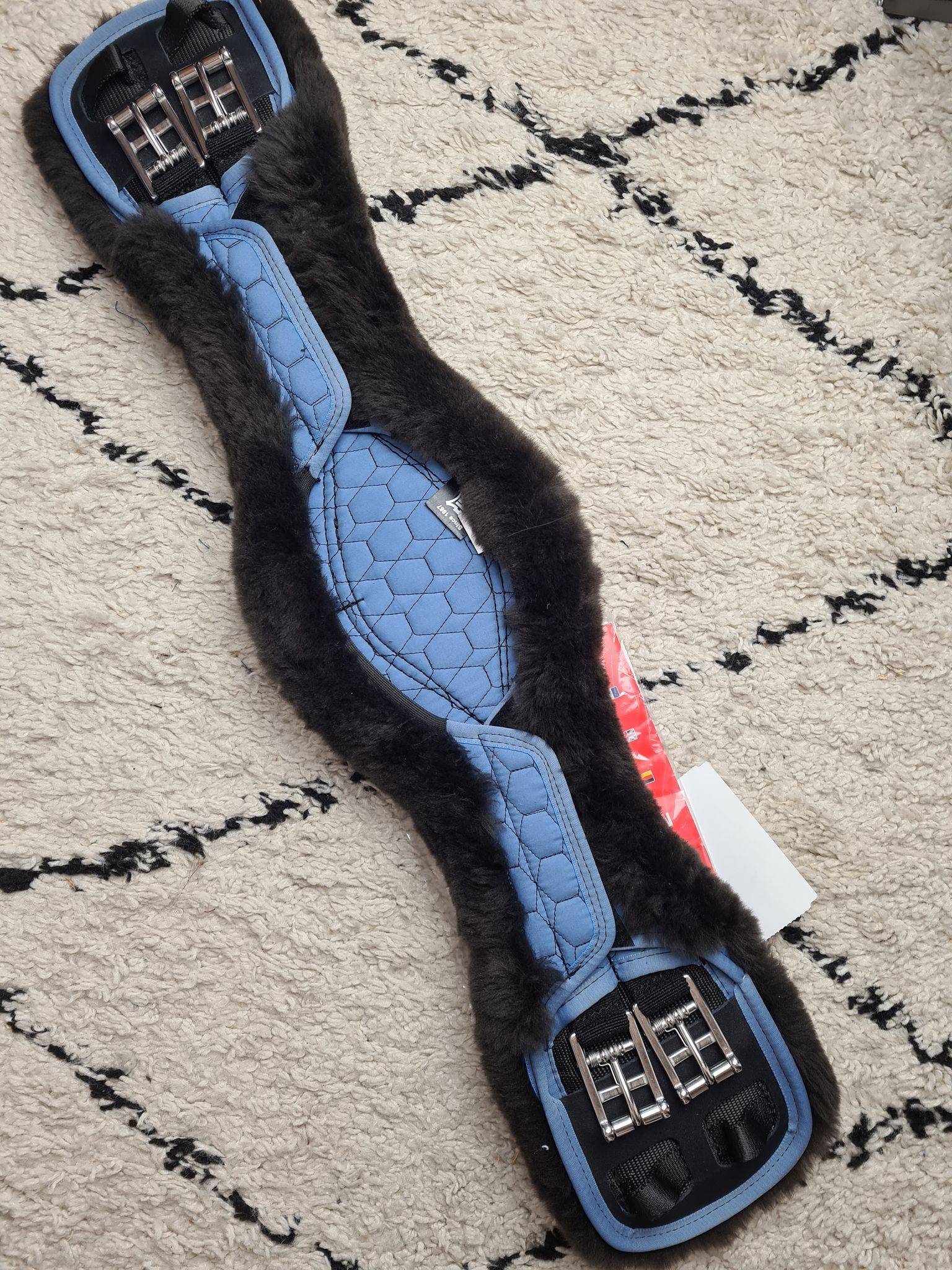 AnatomiquePour les chevaux avec passage de sangle marqué et situé suffisamment loin du coude. La sangle est découpée à l‘avant comme à l‘arrière au niveau du coude. (La sangle peut être tournée.) Couleur du tissu : Cornet BlueCouleur du mouton : Marron