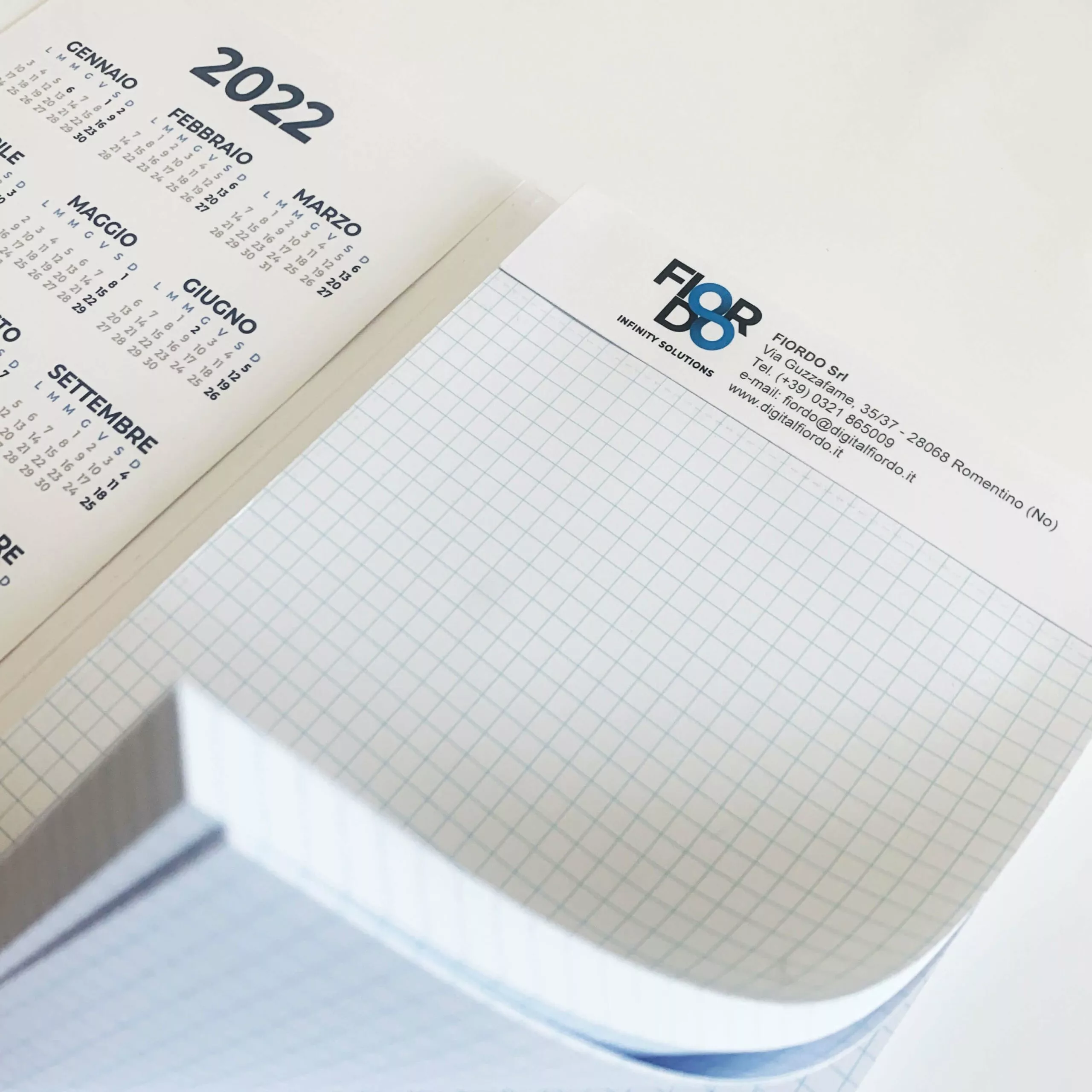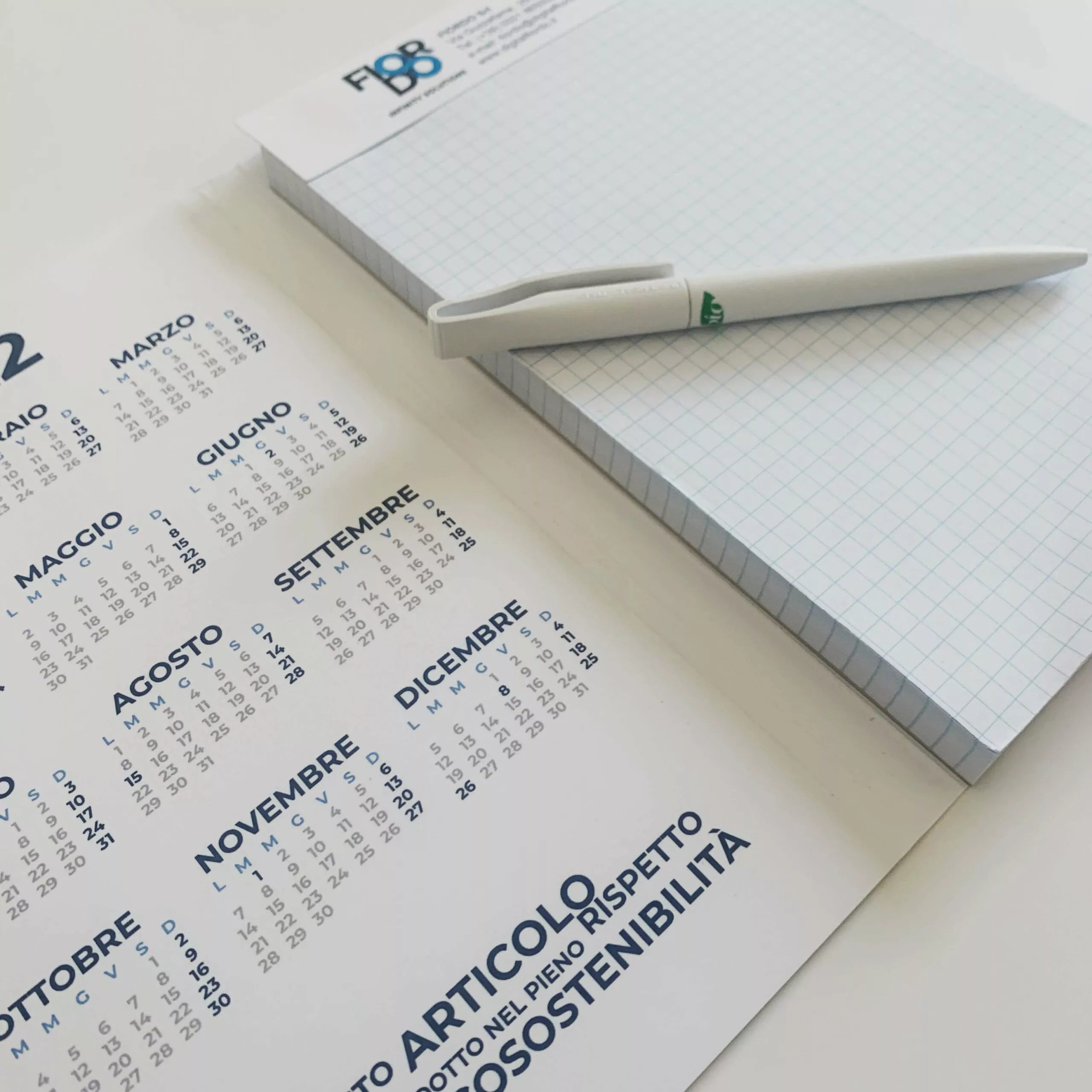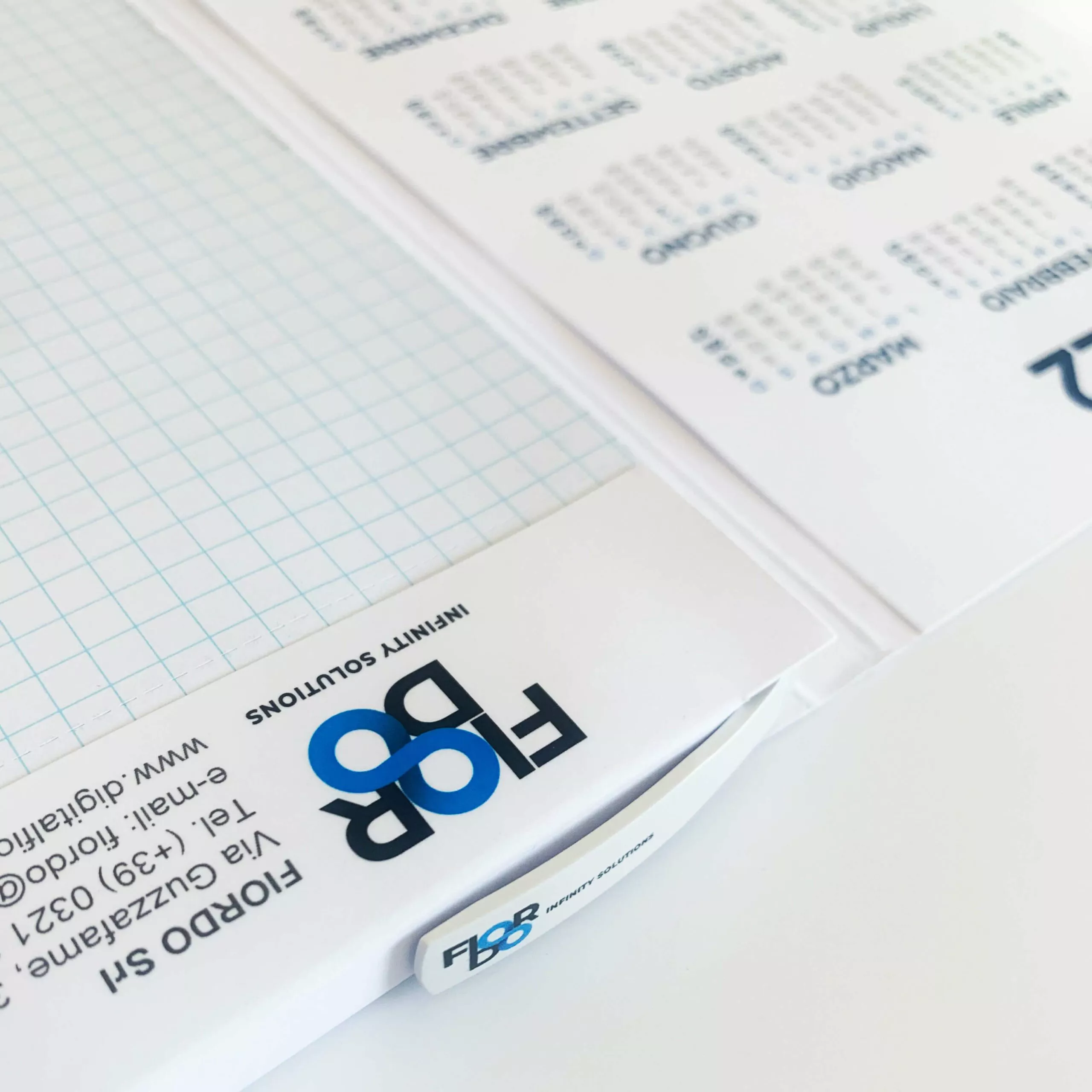 Ce set bloc notes avec stylo A5 possède un calendrier en 2ème de couverture ainsi qu’un entête avec logo personnalisable en haut du bloc notes.