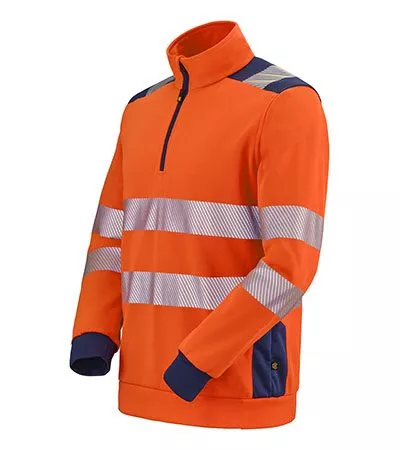 Sweat haute visibilité contient un col camionneur fermé par fermeture à glissière ainsi qu’un protège-menton.
