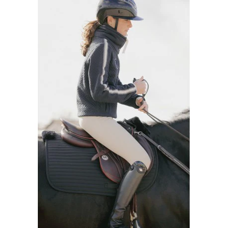 Tapis de selle « Lyona » Pénélope au fin matelassage horizontal, doté d’un renfort en fausse fourrure sous la selle, puis au niveau du garrot et à l’arrière de la selle.