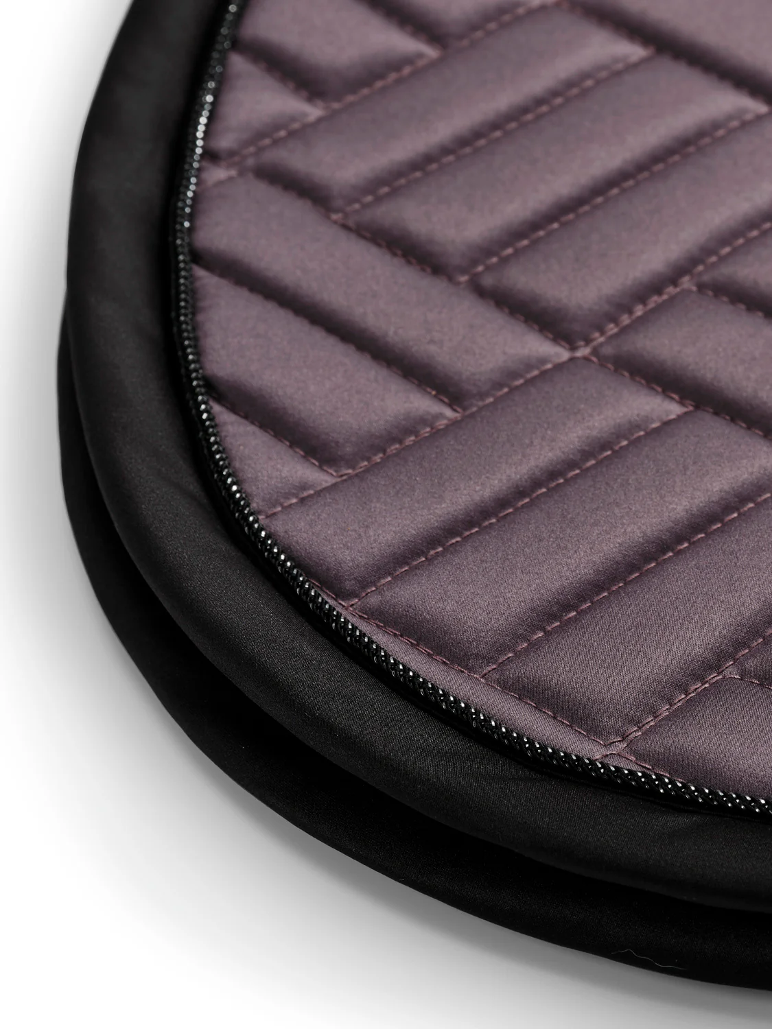 Tapis de selle élégant avec un matelassage moderne, de couleur violet foncé et avec des détails argents et noirs.