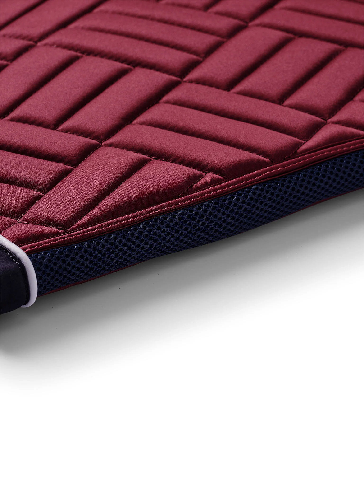 Tapis de selle élégant avec un design moderne, en deep red avec des détails blanc et bleu marine. Décoré d’un badge Equestrian Stockholm en noir.