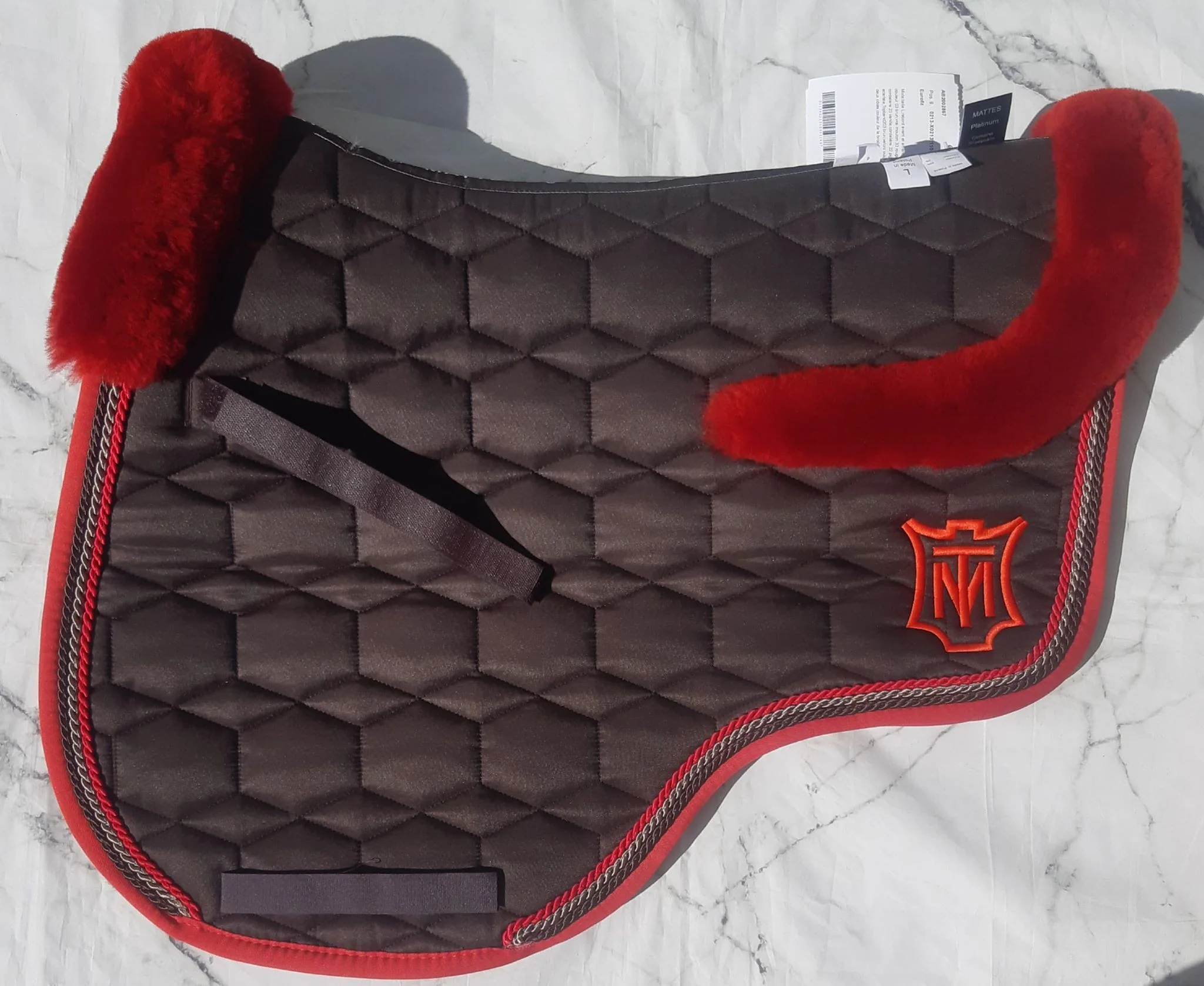 Tapis Eurofit MATTES en coton piqué serré MARRON SATINE composé de peau d’agneau véritable ROUGEPassants de selle et passants de sangle pour éviter que le tapis bouge. – Cordelettes rouge, pigeon et marron – Liseré rouge Choisissez les options suivantes: – 4 tailles disponibles: S (16,5″), M (17″), L (17,5″) et XL (18″)
