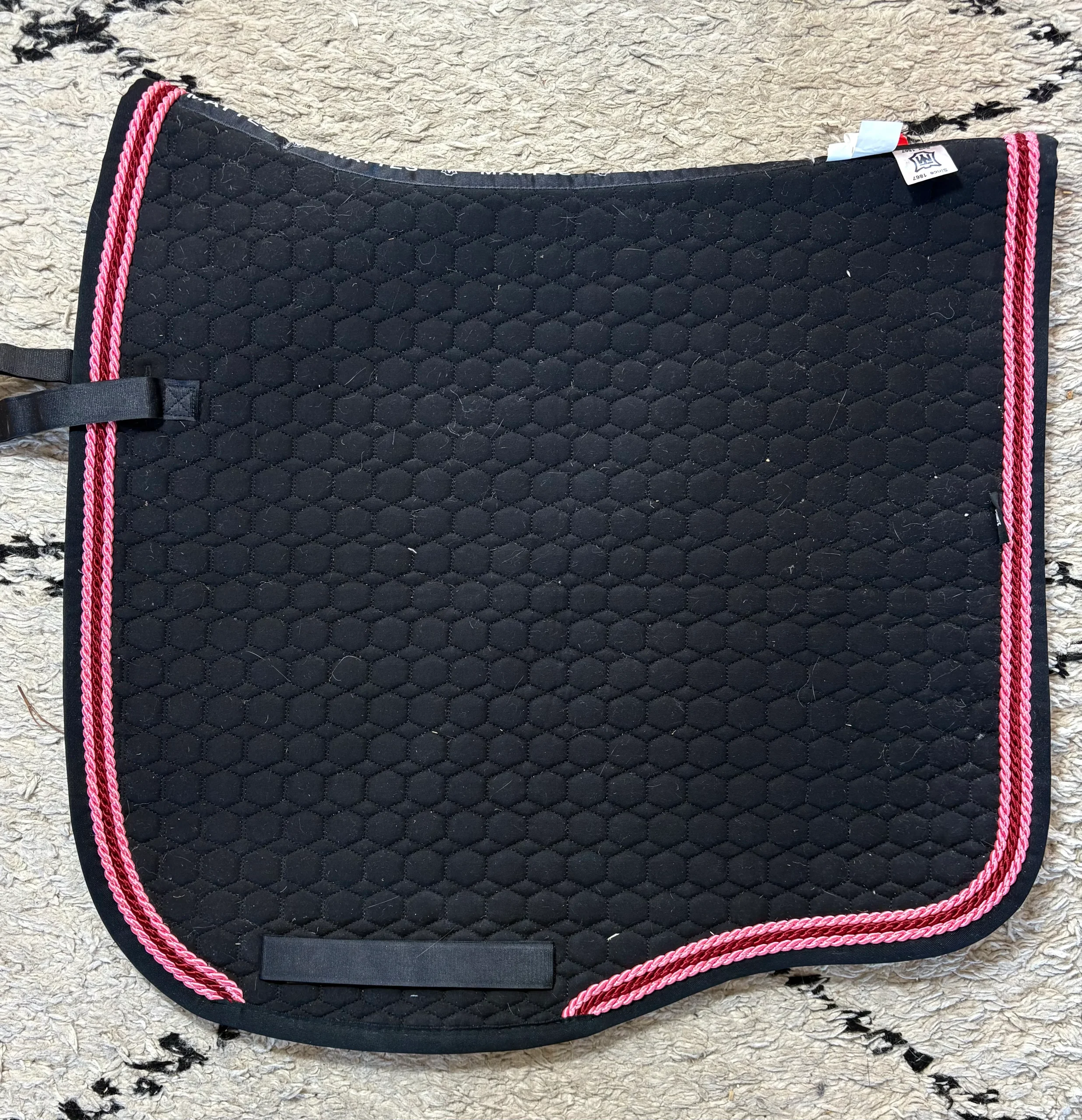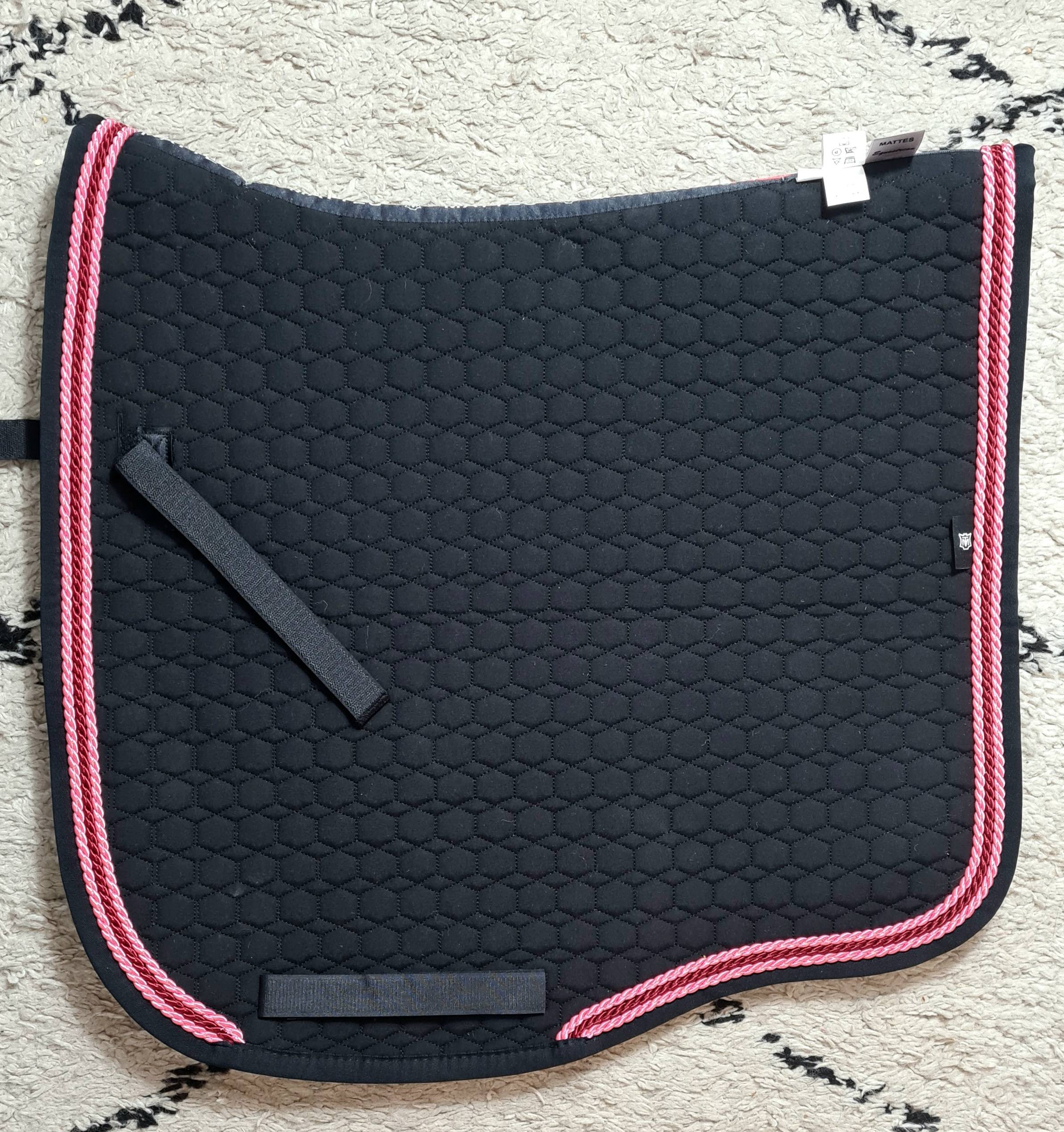 Tapis Eurofit MATTES en coton piqué serré NOIR avec bord noir Cordelette rose pâle, rose fuschia, rose pâle Passants de selle et de sangle pour éviter que le tapis bouge. 4 tailles disponibles: S (16,5″), M (17″), L (17,5″) et XL (18″)