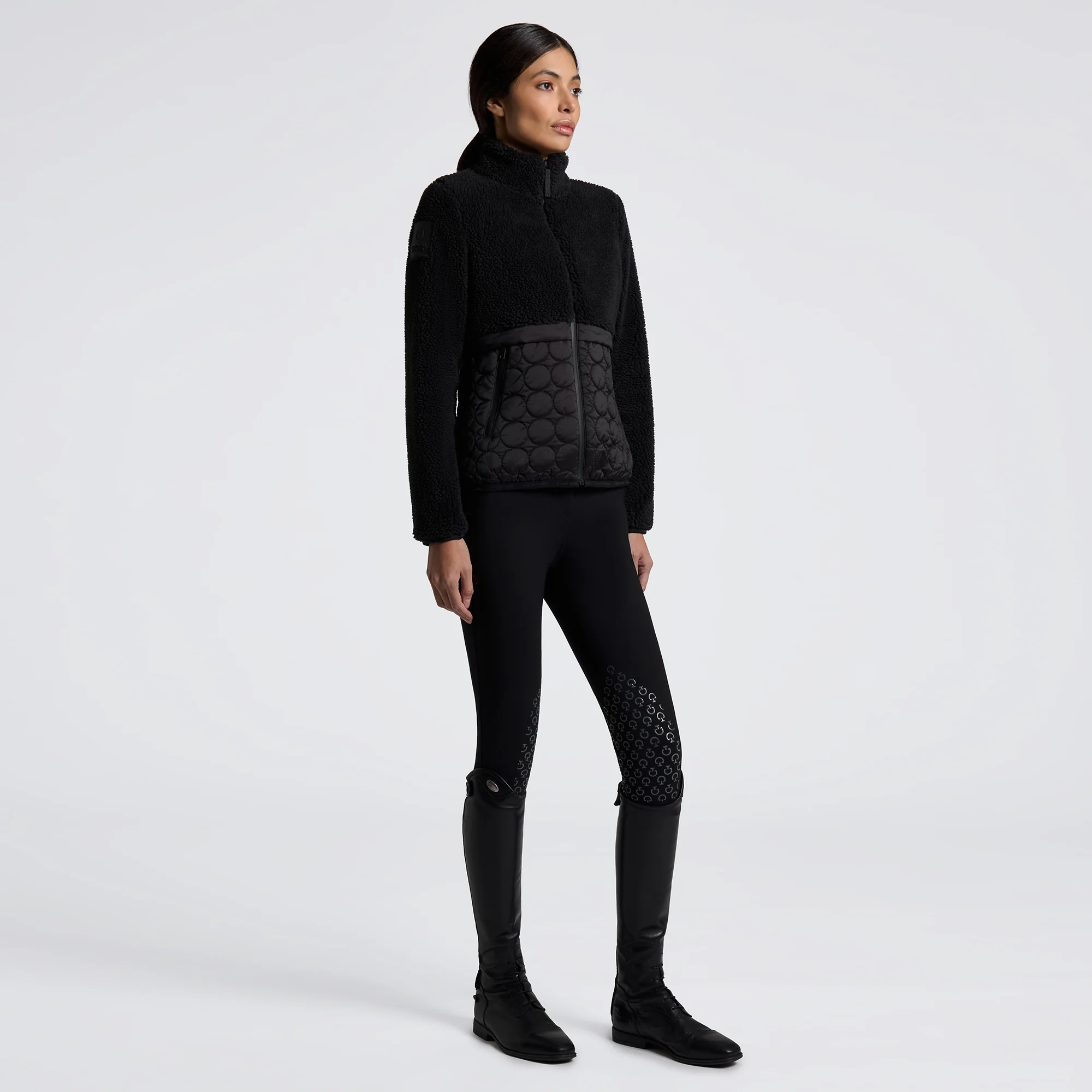 La coupe moderne et ajustée souligne la silhouette tout en garantissant une aisance parfaite à cheval comme au quotidien. Son design monochrome noir est sublimé par le matelassage circulaire signature de la marque, ajoutant une touche de sophistication sportive. Les fermetures éclairs sont imperméables et le bas de la veste a des ourlets élastiques pour assurer une totale liberté de mouvement.